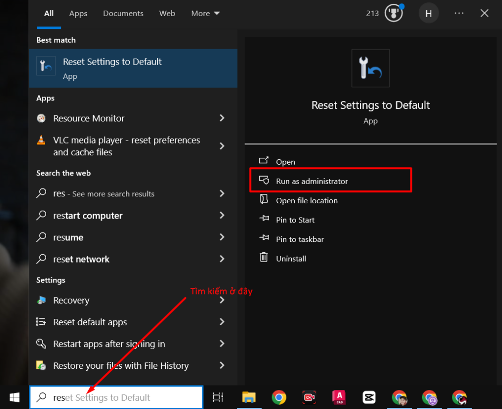 Bước 2: Vào Start Menu → tìm kiếm Reset Settings to Default. Sau đó nhấp đôi hoặc bấm Run as administrator để chạy